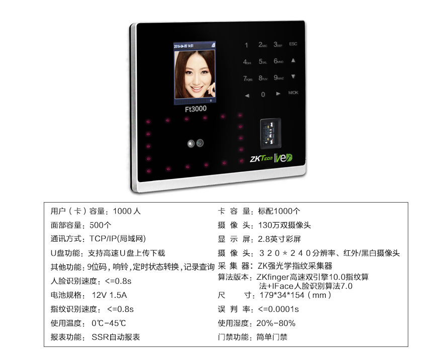 • 產品描述:ZKTeco熵基FT3000人臉識別考勤門禁一體機